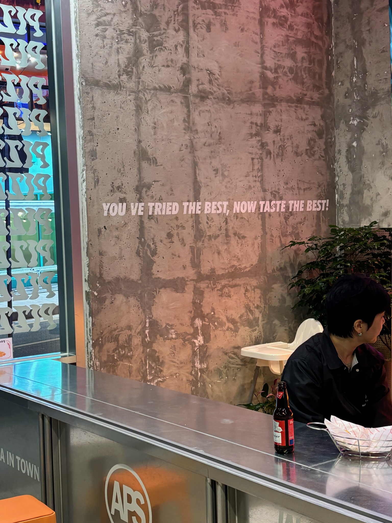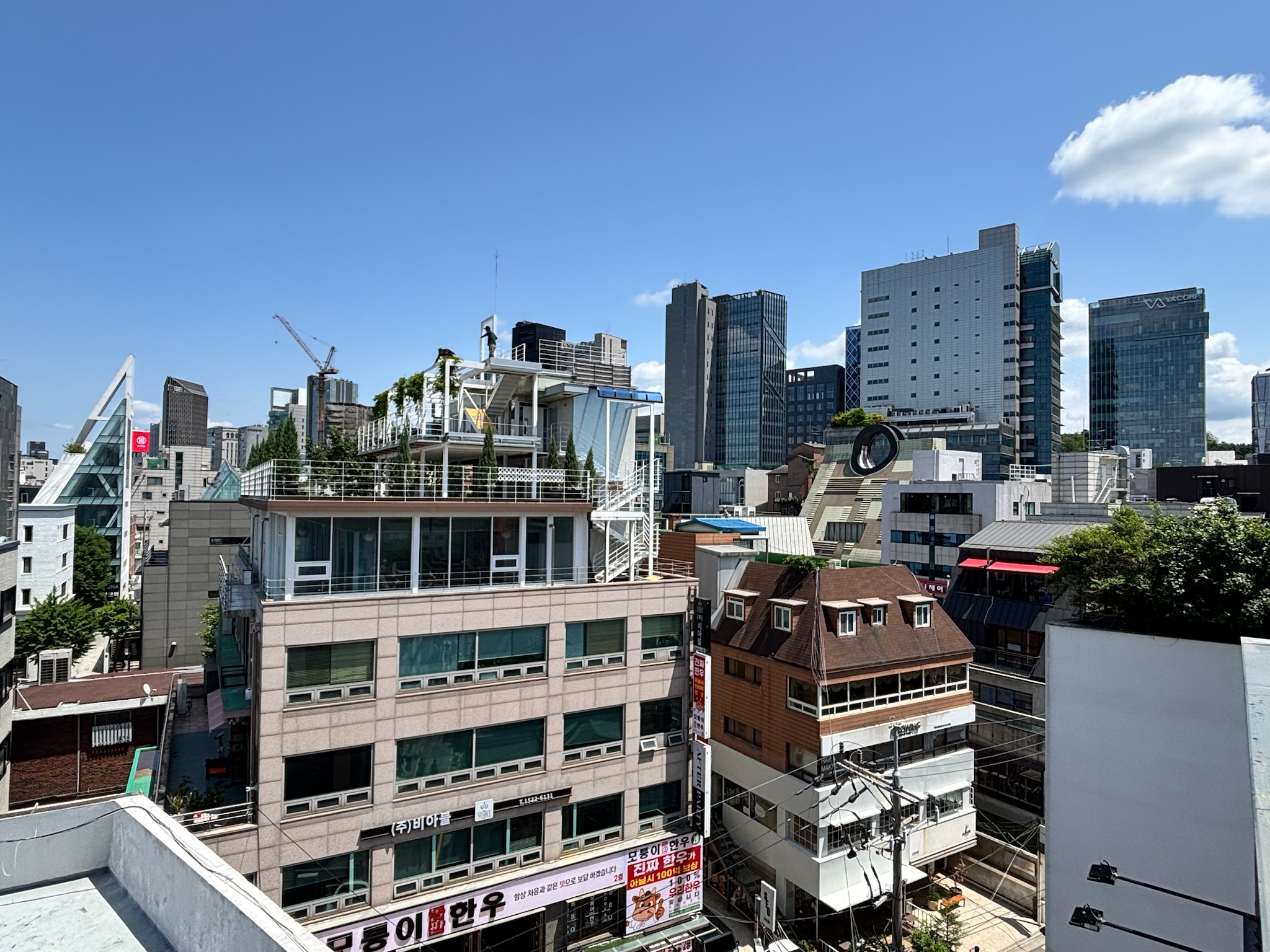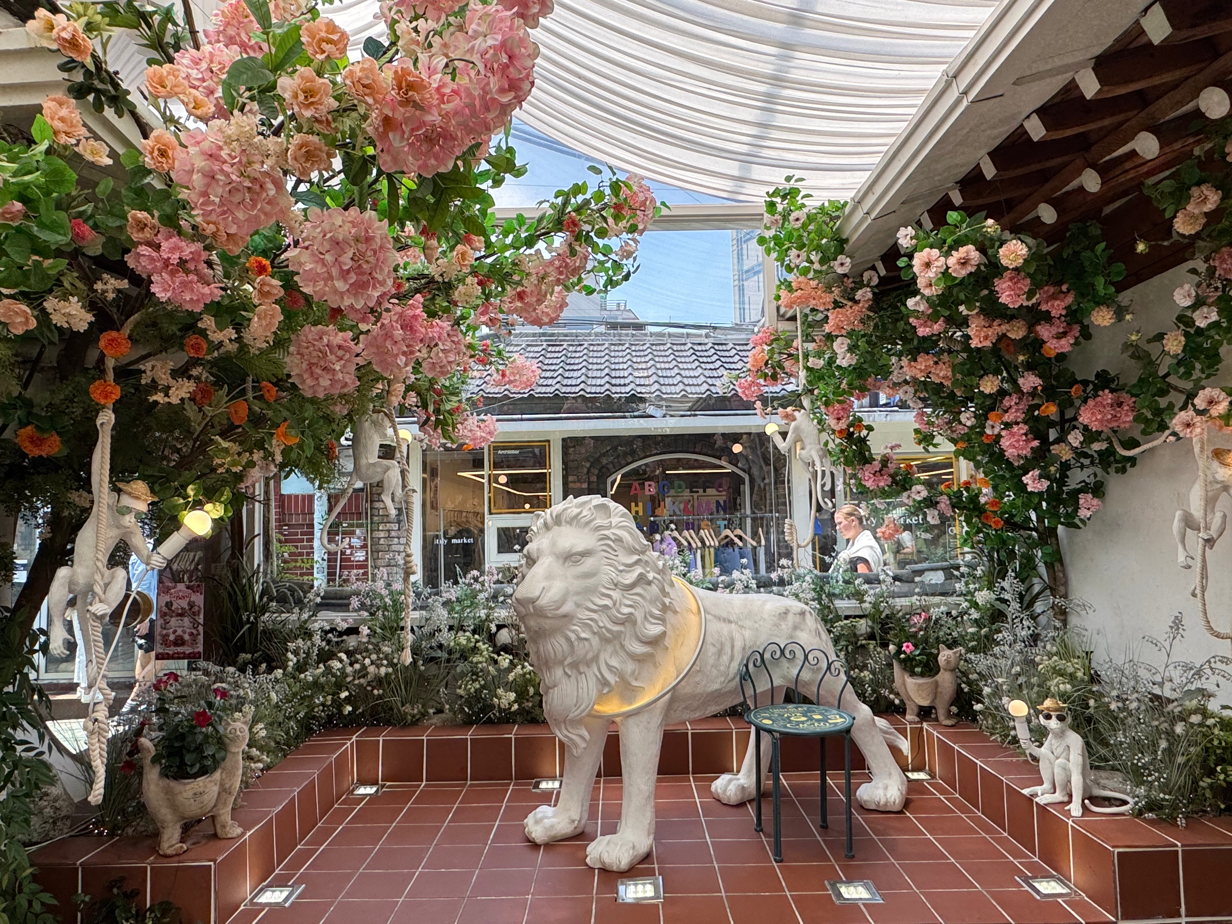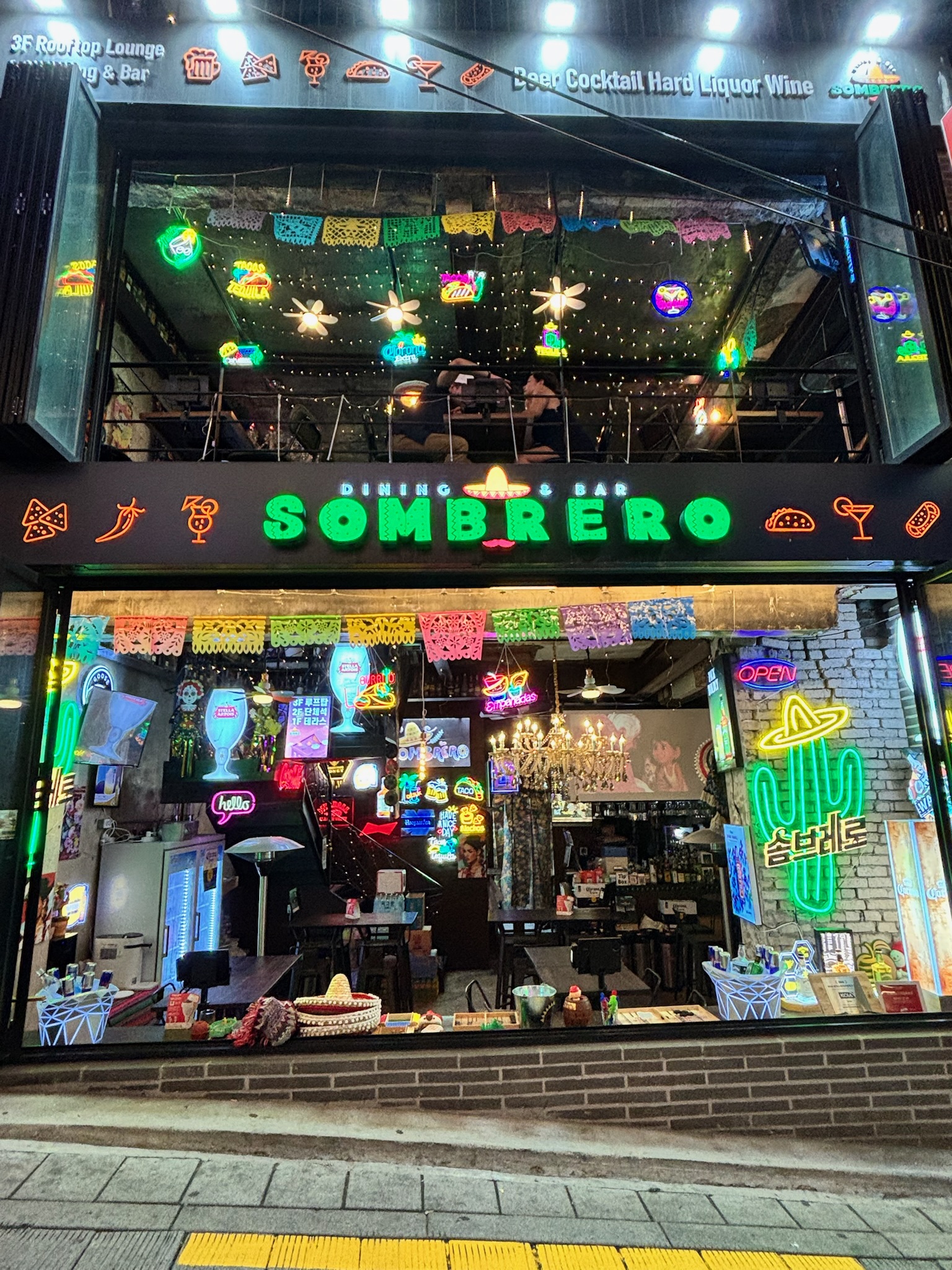 - The Roof Seoul: Enter via a dimly lit, record-themed bar on the 8th floor (they love their records in Koreal), and take the stairs up to the rooftop. Live music spins as the crowd overlooks Myeongdong. The aesthetic felt very tropical underground meets Brooklyn with neon lights, umbrellas, and a hint of grunge. I wasn’t feeling boozy, but I did order a hibiscus tea. Other notable menu items include: espresso martinis, Sex on the Beach, various highballs, jambalaya, charcuterie, spiced popcorn, and kimchi.