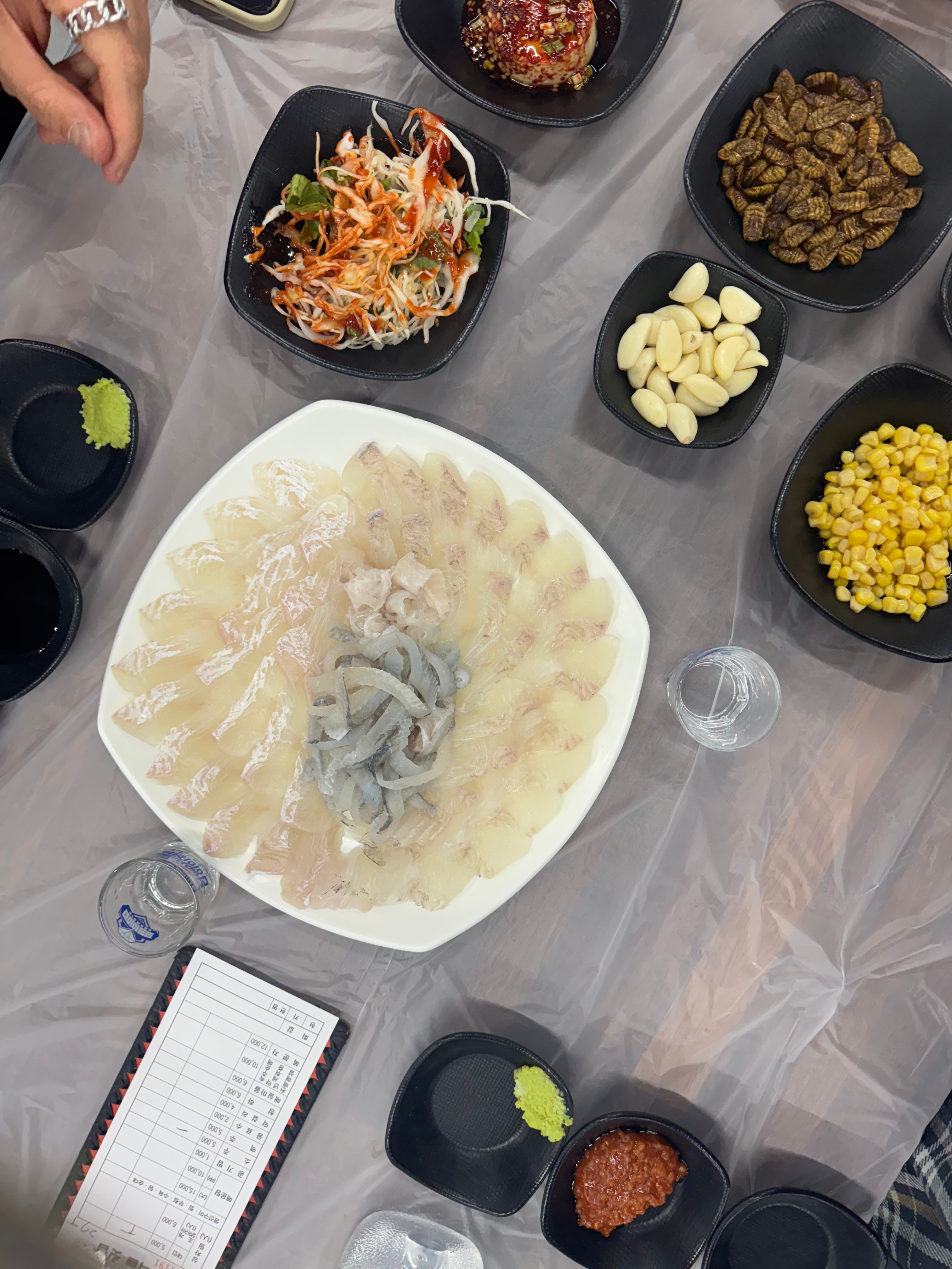 - Millak Raw Fish Market: If you are a fan of seafood, I cannot recommend this market enough. Local fisherman sell fish you’ve probably never seen, including rockfish, flatfish, flounder, and mullet. Each vendor will try and pull you in to sell their freshly caught haul. We weren’t sure if there was a smart way to choose, so we let the loudest men entice us. After pointing to a couple fish in the tanks, we were directed to head upstairs as they prepared the sashimi. Pictured below is our flatfish/rockfish combo. The fish is served with many side dishes, including kimchi, corn, tofu with scallions and a gochujang sauce, beondegi (aka silkworm pupae – don’t be intimidated by it, the flavor is nutty and such a compliment to the fish), wasabi, and raw garlic. We opted for some Busan soju to wash everything down. 500/10 experience. Would eat this every day for the rest of my life if I could. Especially when it’s only $35 USD.