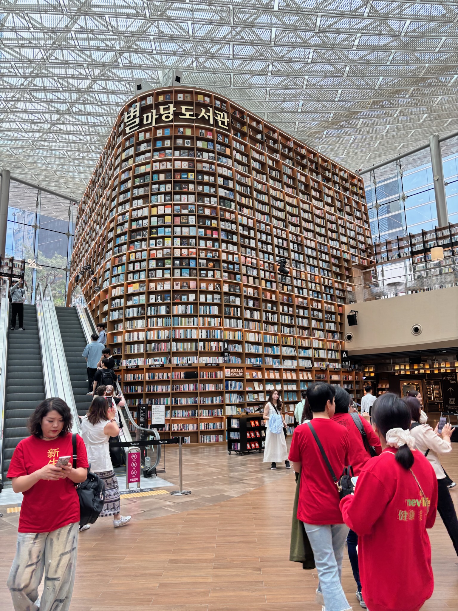 - Gangnam: Think 5th Ave in New York City. Gangnam is coated in luxury; it’s no wonder PSY dedicated an entire song to the style. We made Coex Mall our destination, because it’s the largest underground mall in Asia, and we HAD to see their library with 42-ft-high bookshelves (pictured). There is also a MASSIVE bronze statue of the Gangnam Style hands on the mall lawn.