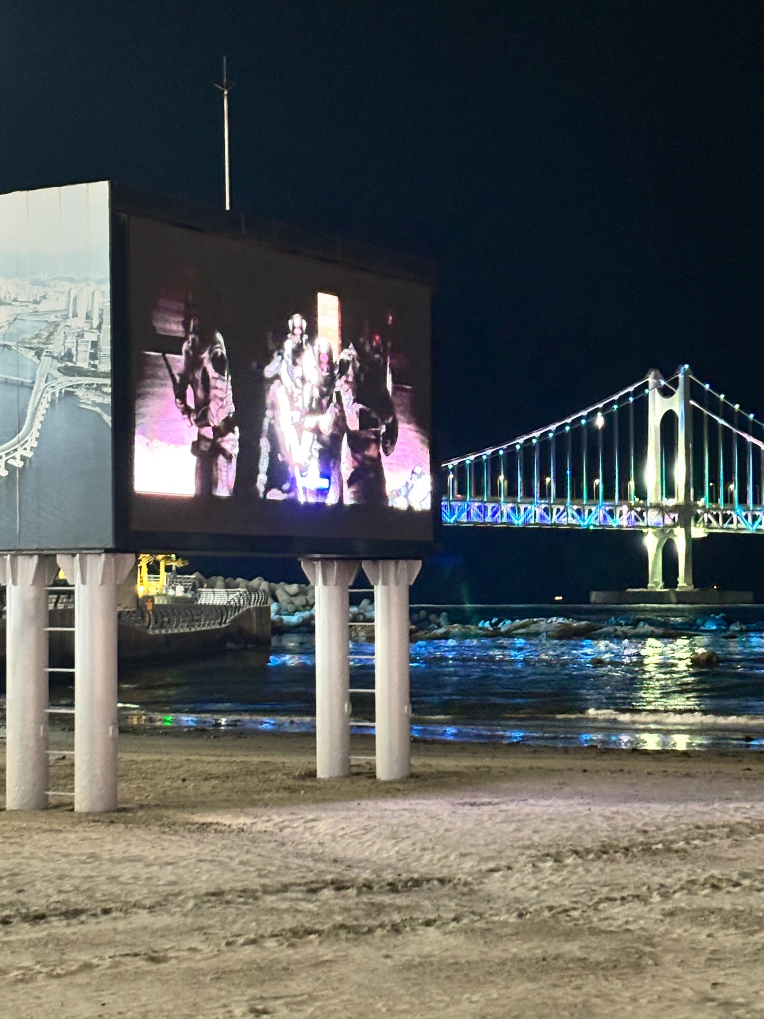 - Gwangalli Beach: Unlike any beaches I’ve been to, Gwangalli’s coastline is vibrant, clean, and picturesque. You can view movies in the evening on one corner of the beach (Dune 2 was playing our first night), watch a firework/drone show every Saturday night, go for a swim after watching a street performer sing his heart out, and even set up a table for Korean BBQ if your heart so desires.