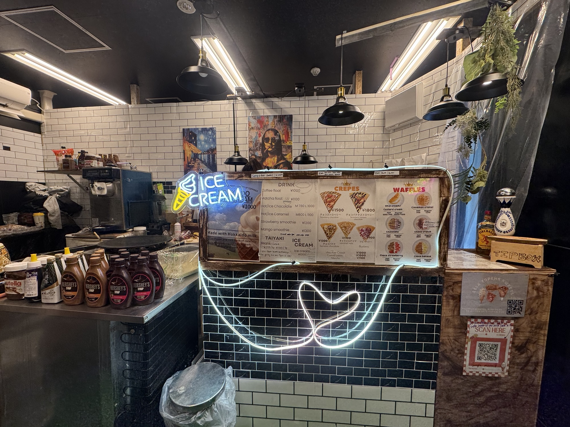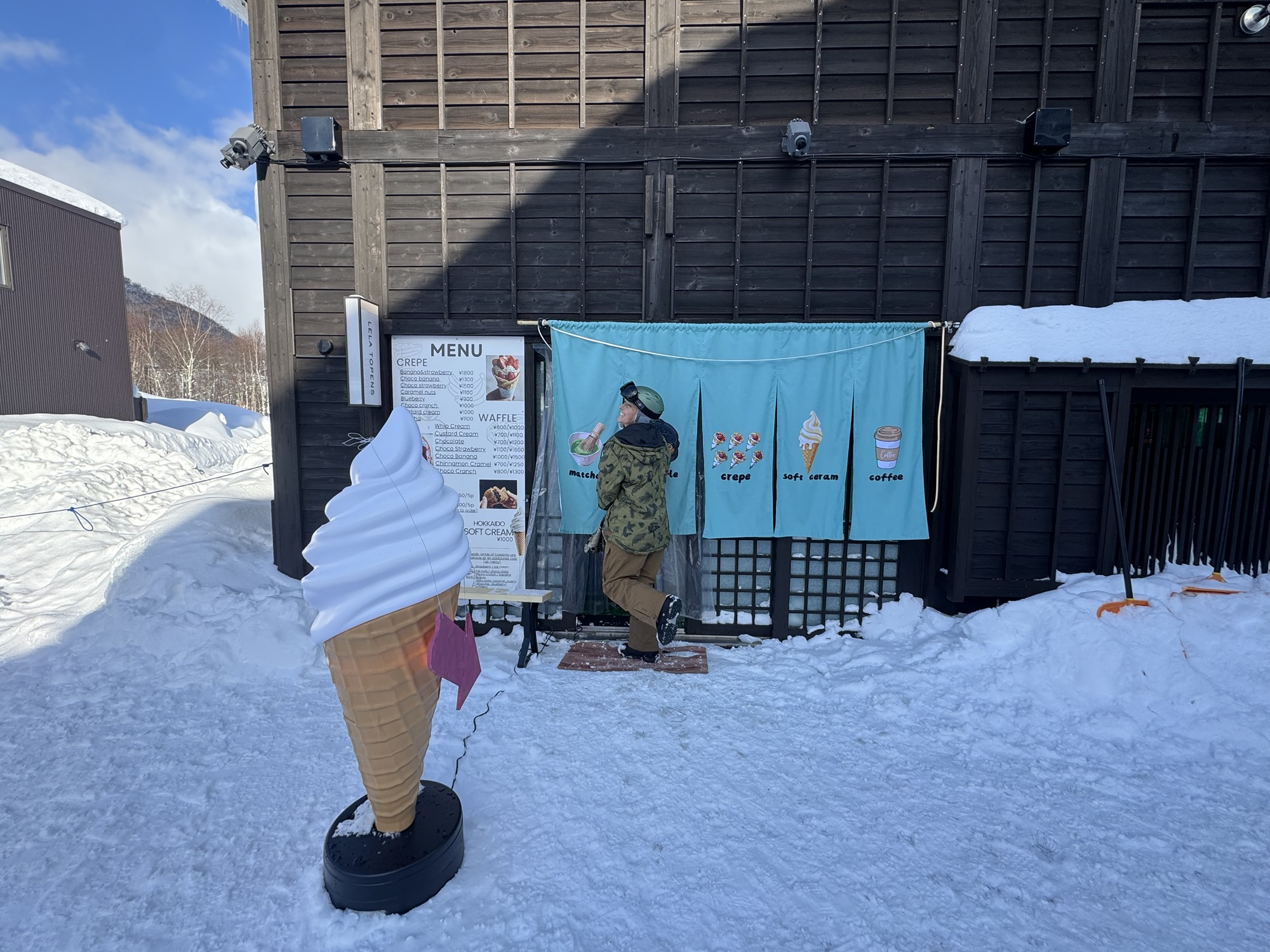 - Lela Topens: Delicious Hokkaido milk ice cream, stuffed crepes, and waffles covered in syrups and candy – what more could one possibly want out of a dessert store? Lela Topens is situated in the Niseko Village shops; look for the giant ice cream cone statue. My personal recommendation is having a shot of Fireball with the milk ice cream as a chaser.