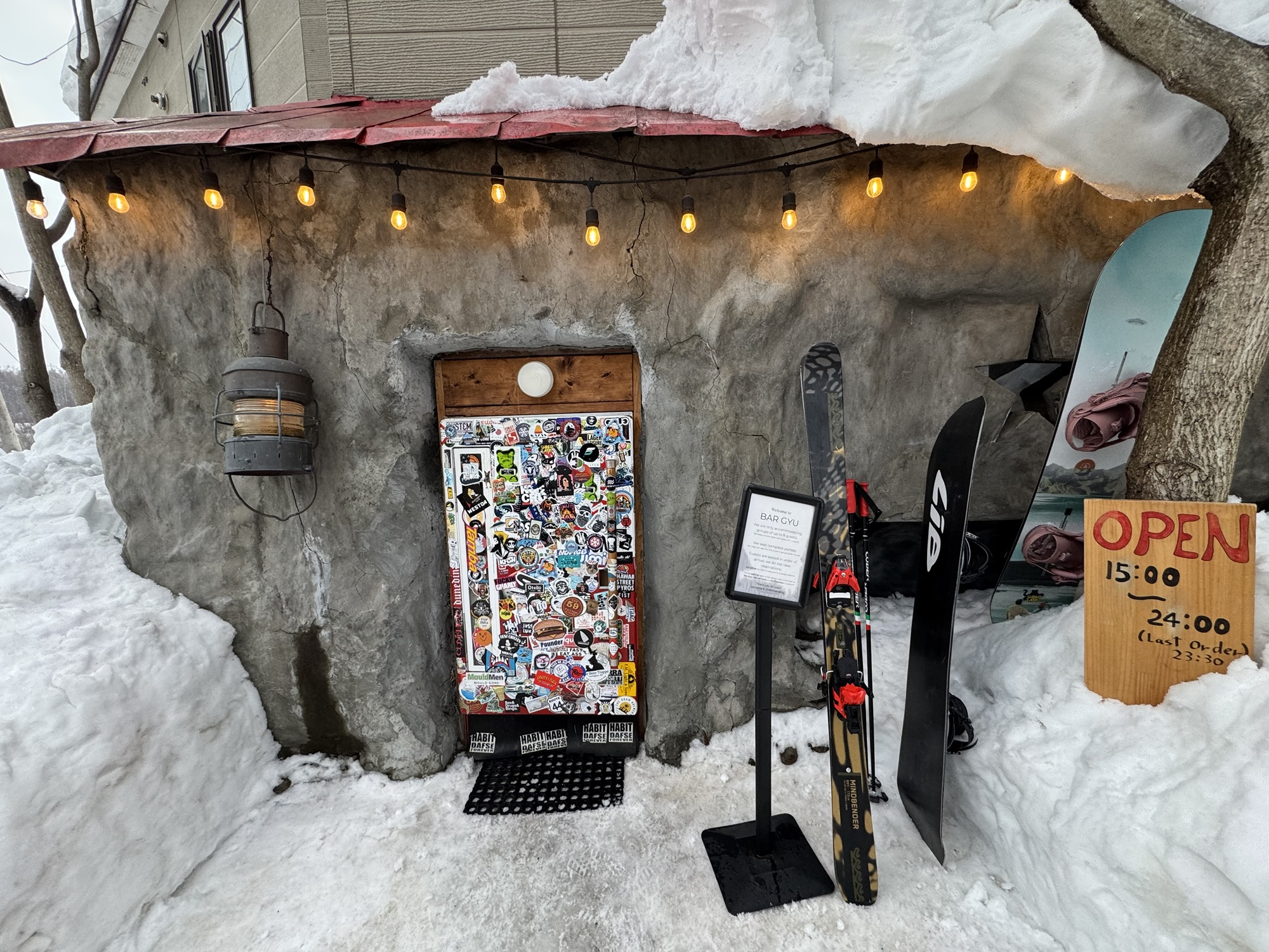 - Bar Gyu: A MUST STOP on your Niseko ski trip – don’t let anyone tell you it’s overrated. The wait is worth the hype, trust me! In 1999, Hisashi Watanabe started this fridge door (yes, you enter via a refrigerator just sitting in some snow) bar as an unassuming venue for locals and visitors to experience something unique. Each year, Watanabe and his wife, Ionna, hand write and draw up a new menu of captivating cocktails. A few of my previous favorites include the, ‘Hot Apple Pie,’ with Yoichi apple juice, vanilla-infused vodka, cinnamon, clove, and lemon, as well as the, ‘Je Ne Sais Poire,’ with Hokkaido Shakotan peninsula gin, pear brandy, white vermouth, and absinthe. You can read more about their story here.